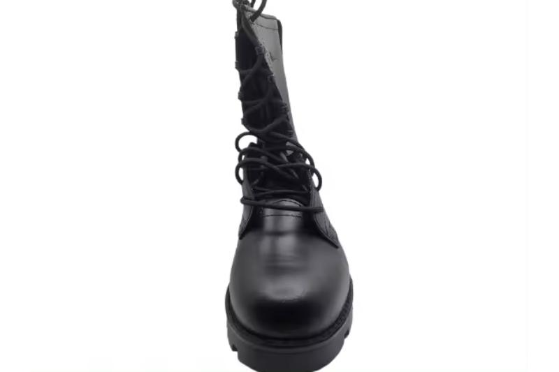 Botas militares para hombre fabricadas en piel negra de alta resistencia. Diseño de caña alta con cordones y suela dentada antideslizante, ideales para uso intensivo y condiciones exigentes.