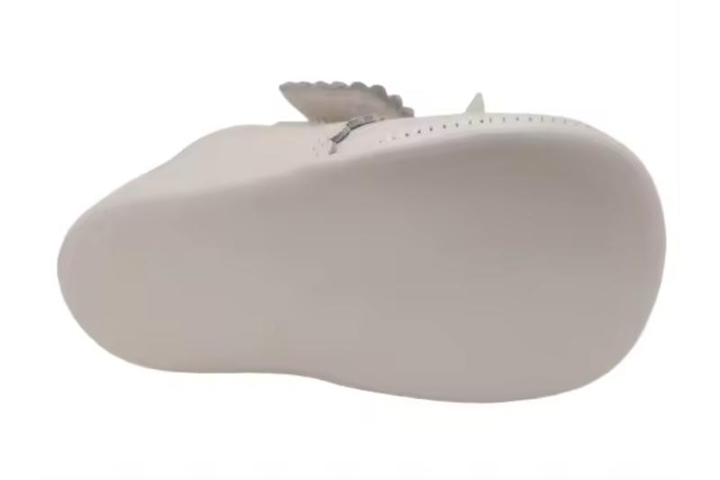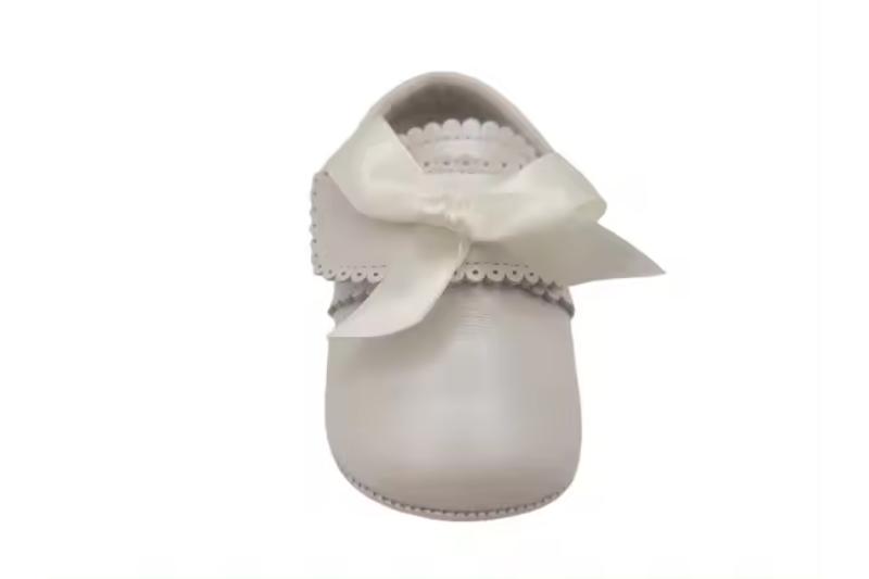 Merceditas de piel para bebé en color beige, fabricadas en piel suave de alta calidad. Diseño elegante con borde festoneado y lazo de raso en la parte frontal. Perfectas para ceremonias, bautizos y ocasiones especiales.