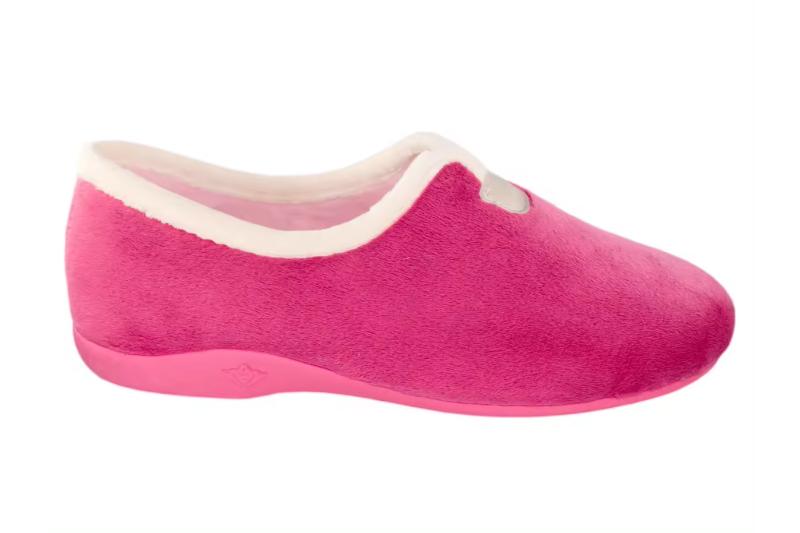 Zapatillas de casa cerradas para mujer fabricadas en suave terciopelo color fucsia con ribete en tono claro.
