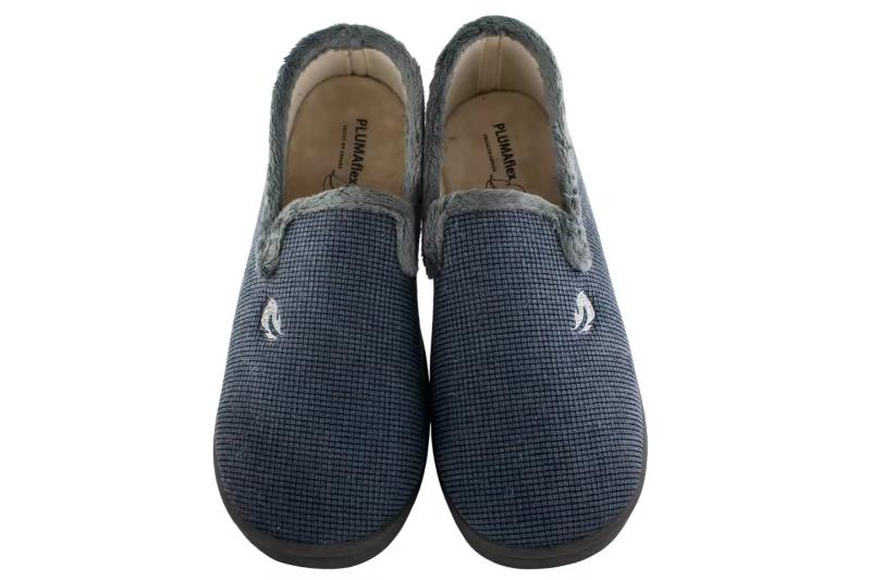 Zapatillas de casa cerradas para hombre con exterior textil en tono marino y suave forro interior de pelo gris.