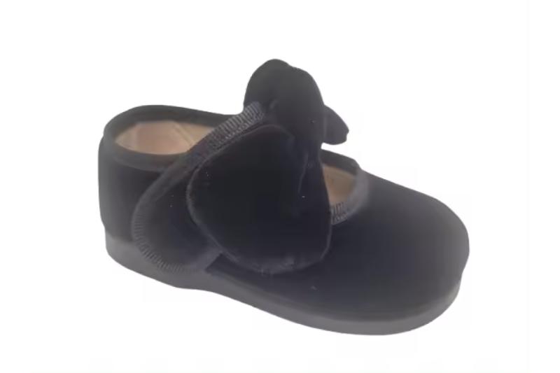 Mercedita de niña en elegante terciopelo negro con lazo decorativo y cierre de velcro. Ideal para el día a día o para ocasiones especiales. Su tejido suave y suela de caucho natural ofrecen comodidad, estilo y durabilidad. Fabricado en España con materiales de alta calidad.