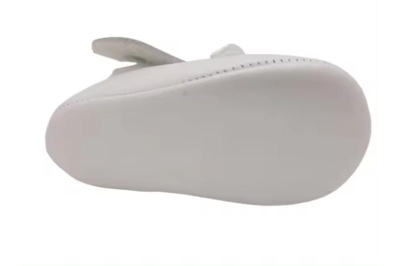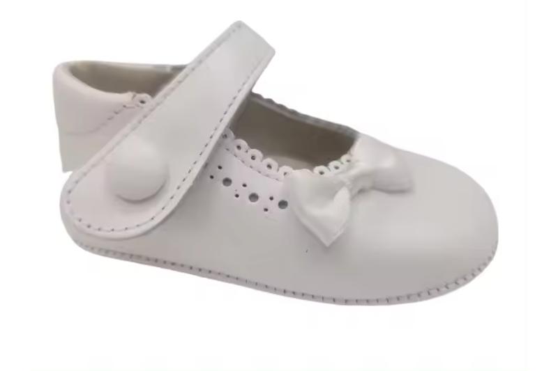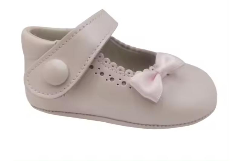 Merceditas para bebé en varios colores, fabricadas en piel suave. Decoradas con un delicado lazo de raso rosa y detalles calados en el borde. Cierre lateral con botón forrado para un ajuste cómodo y seguro. Perfectas para ceremonias y ocasiones especiales.