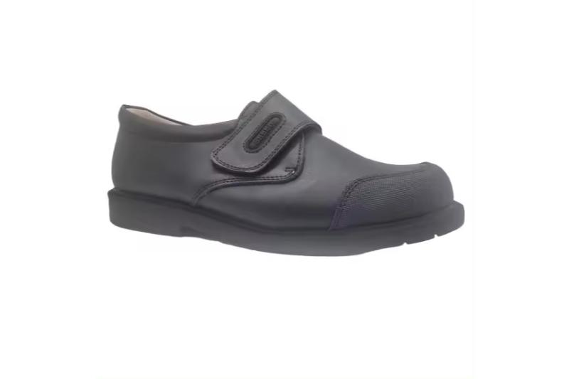 Zapato escolar para niño en color azul marino, fabricado en piel. Diseño con puntera reforzada para mayor durabilidad y cierre de velcro que facilita el calce. Ideal para uso diario en el colegio.